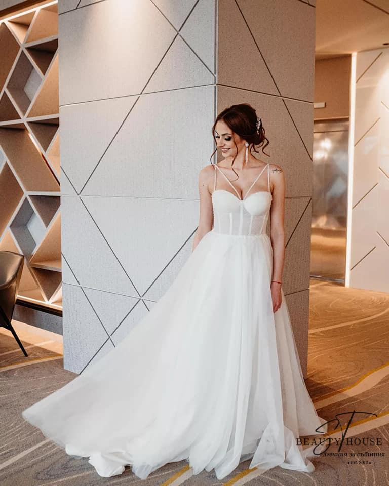Моделът „Бетина“ привлича вниманието с оригиналните презрамки, придържащи горната част на роклята в стил бюстие. Полата пада изящно и красиво. Всеки детайл е изпипан с възхитителен финес.